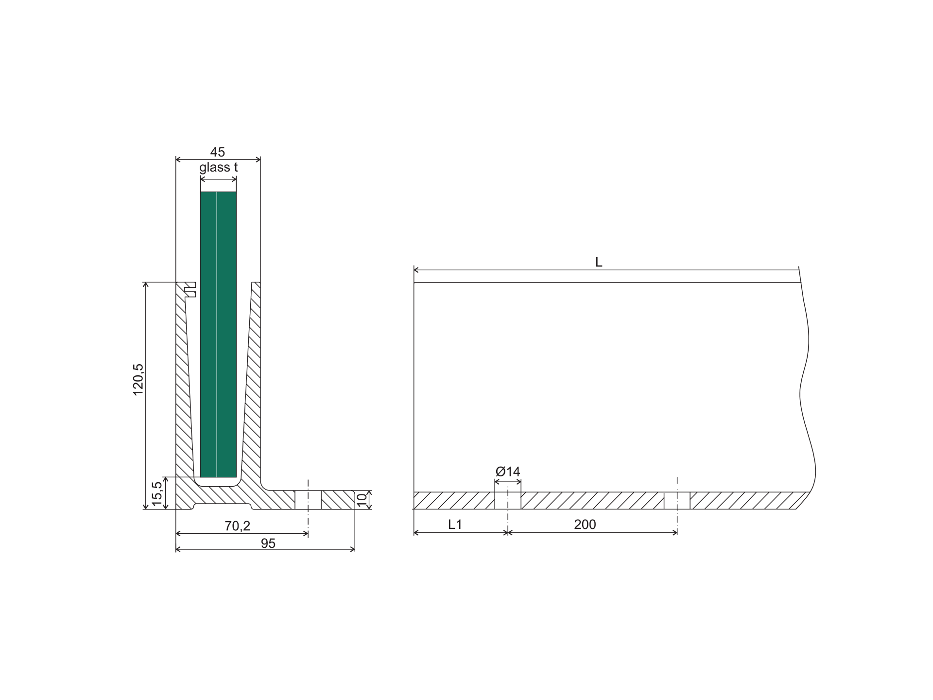 Hliníkový kotvící profil 121/45/95 mm (díra na kotvení 70,2 mm od hrany) pro sklo. Kotvení z vrchu do podlahy. Dodávány v délkách 2500 mm (13ks otvorů d14 mm pro kotvení). Dodávané bez těsnění. Povrchová úprava ELOX - brus.