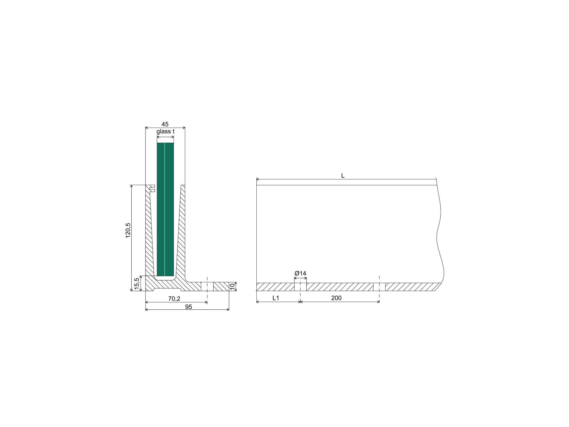 Hliníkový kotvící profil 121/45/95 mm (díra na kotvení 70,2 mm od hrany) pro sklo. Kotvení z vrchu do podlahy. Dodávány v délkách 6000 mm (30 ks otvorů d14 mm pro kotvení). Dodávané bez těsnění. Povrchová úprava ELOX - brus.