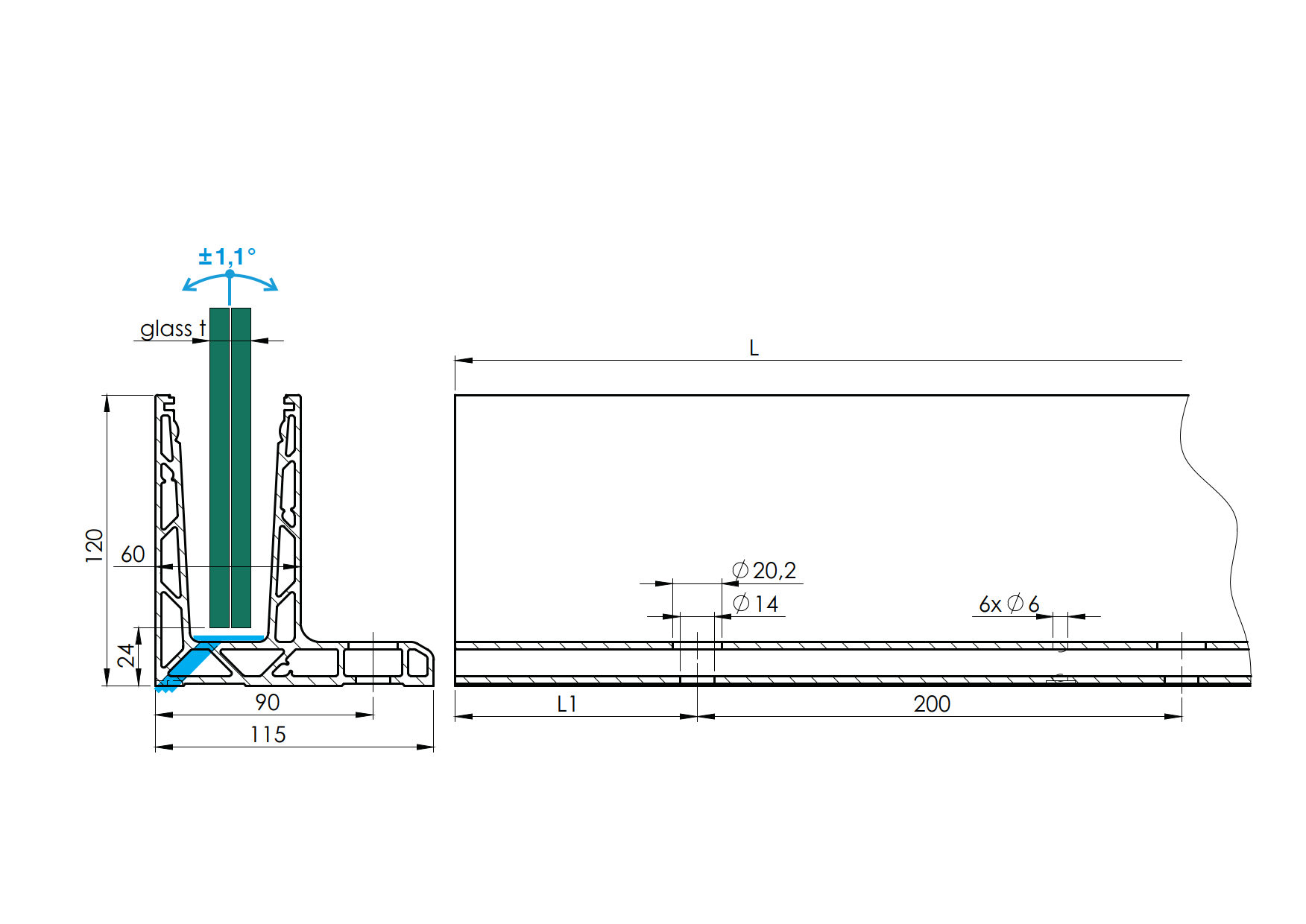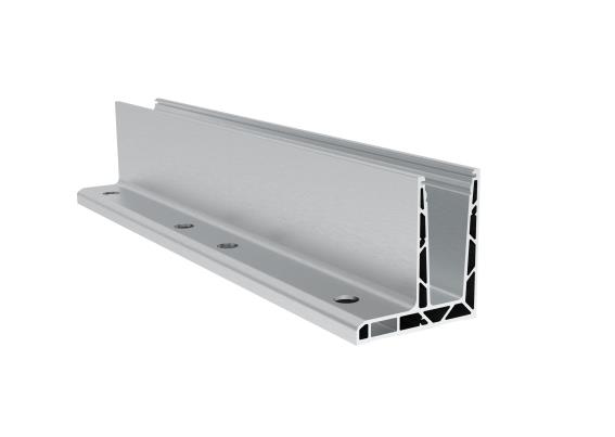 Al. kotvící profil pro sklo T=12 až 17,52mm, kotvení shora do podlahy, nastavitelný sklon skla. Dodáváno v délce L5000mm (25ks otvorů d14mm pro kotvení). Dodáváno bez těsnění. Povrchová úprava ELOX - brus.