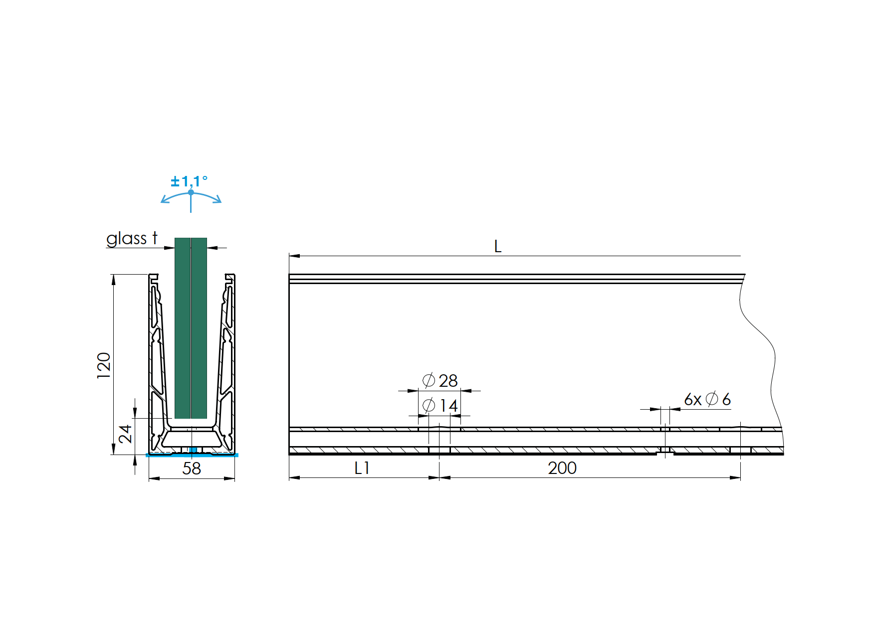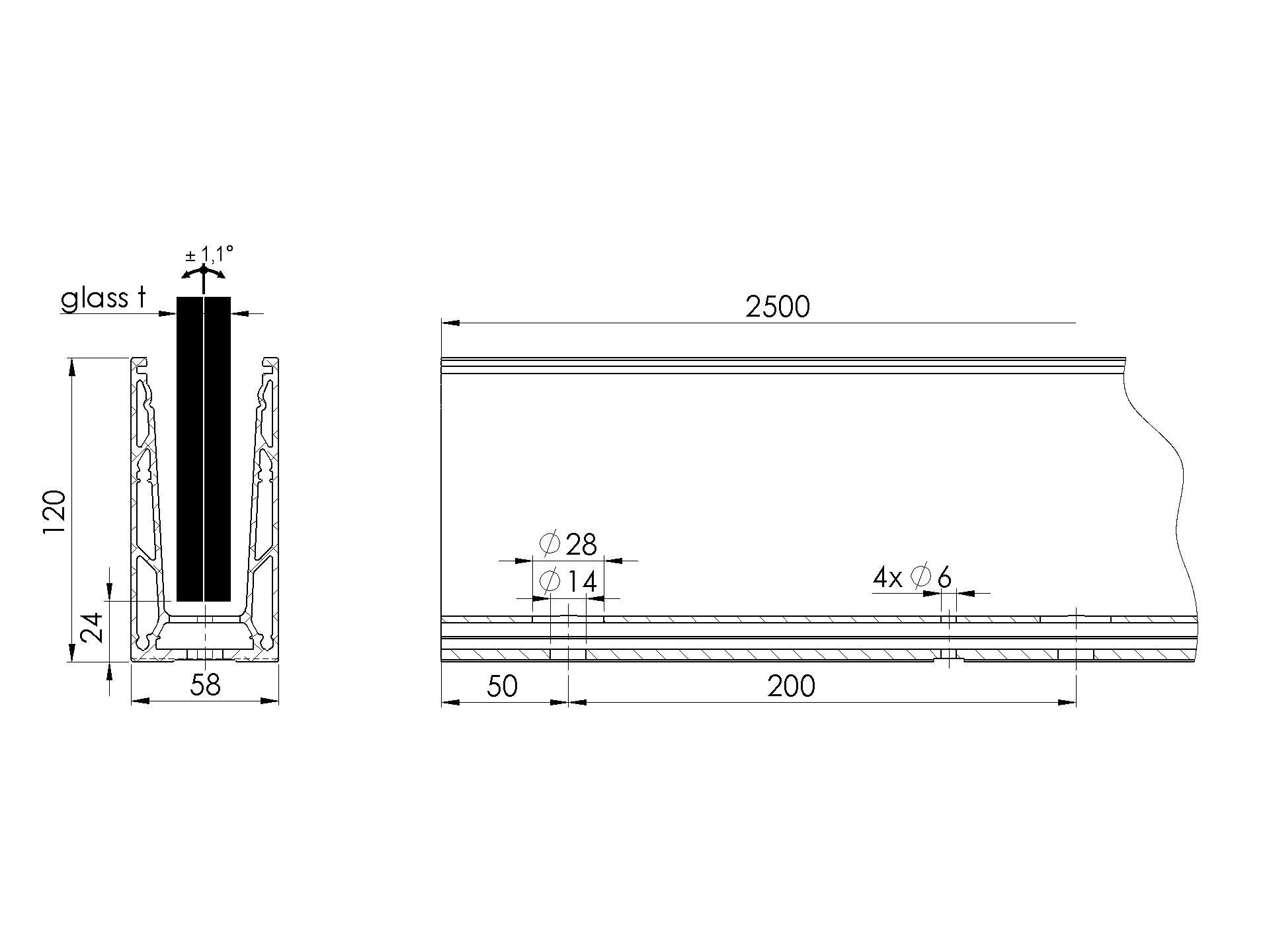 Al. kotvící profil ELOX 120/57mm pro sklo T=12 až 17,52mm, kotvení shora do podlahy, nastavitelný sklon skla. Dodáváno v délkách L2500mm (13ks otvorů d14mm pro kotvení). Dodáváno bez těsnění. Povrchová úprava ELOX - brus.
