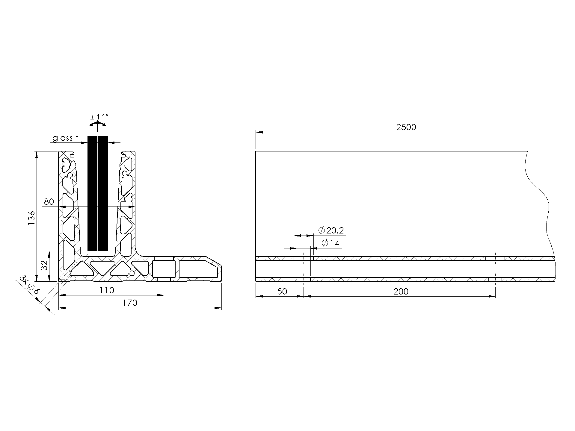 Al. kotvící profil ELOX, kotvení shora do podlahy, nastavitelný sklon skla. Dodáváno v délkách L2500mm (13ks otvorů d14mm pro kotvení). Dodáváno bez těsnění. Povrchová úprava ELOX - brus.