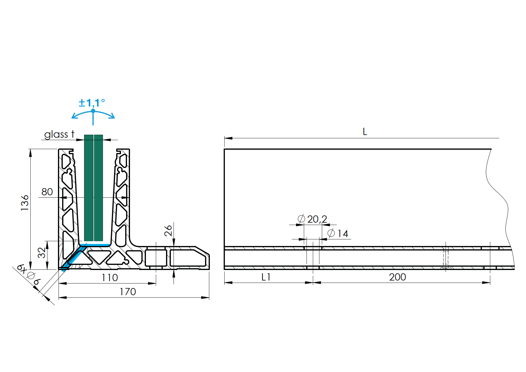 Al. kotvící profil ELOX, kotvení shora do podlahy, nastavitelný sklon skla. Dodáváno v délkách L5000mm (25ks otvorů d14mm pro kotvení). Dodáváno bez těsnění. Povrchová úprava ELOX - brus.