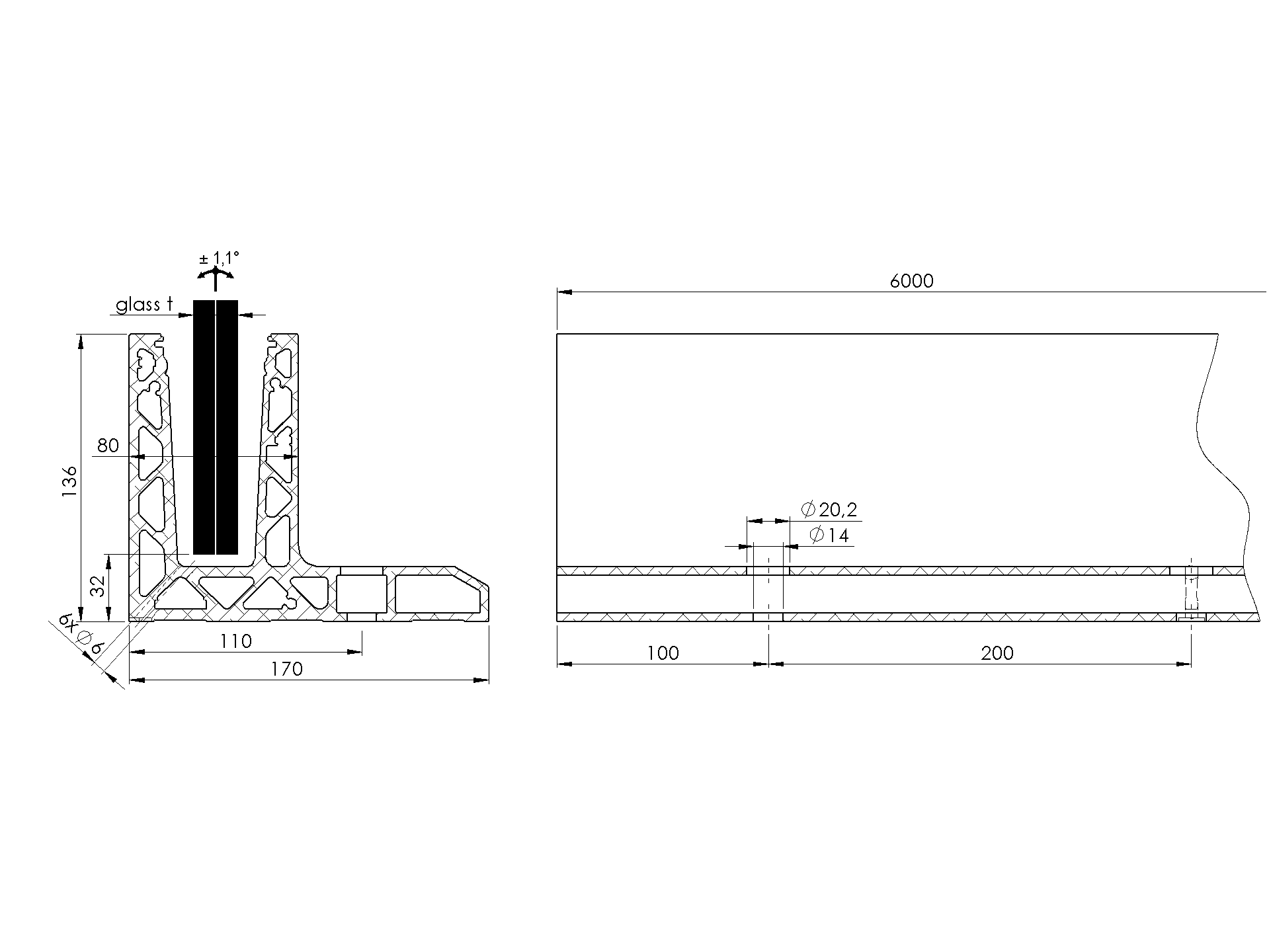Al. kotevní profil ELOX, kotvení z vrchu do podlahy, nastavitelný sklon skla. Dodáváno v délkách L6000mm (30ks otvorů d14mm pro kotvení). Dodáváno bez těsnění. Povrchová úprava ELOX - brus.