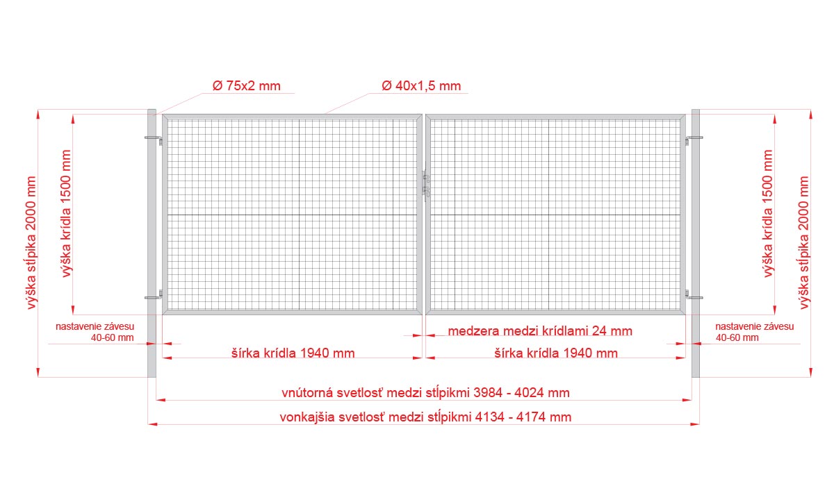 Výplň brany je svařovaná síť. Velikost oka 50x50mm. Průměr drátu D 4mm. Průměr sloupků D 75mm. Výška sloupků 2000mm. Tloušťka stěny sloupků 2,0mm. Povrchová úprava: zinek + RAL6005 zelená. Součástí balení je také zámková část a klika.