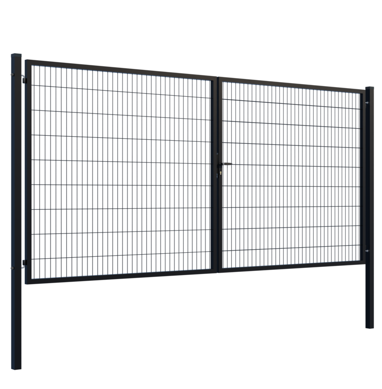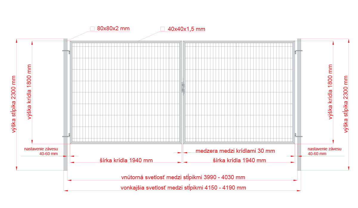 Výplň brány svařovaná síť.Rozměr oka 200x50mm.Průměr drátu 4mm. Profil sloupků 80x80x2mm.Výška sloupků 2300mm.Profil rámu 40x40x1,5mm.Povrchová úprava: ZN+RAL9005 černá.Součástí balení je zámková část, klika, zástrč a středový doraz.