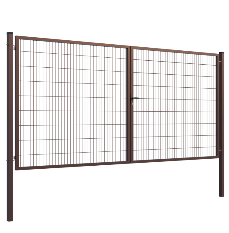Výplň brány svařovaná síť.Rozměr oka 200x50mm.Průměr drátu 4mm. Profil sloupků 80x80x2mm.Výška sloupků 2300mm.Profil rámu 40x40x1,5mm.Povrchová úprava: ZN+RAL 8017 hnědá.Součástí balení je zámková část, klika, zástrč a středový doraz.