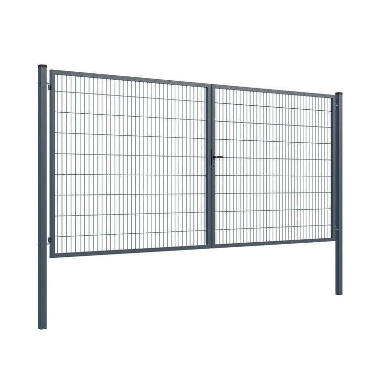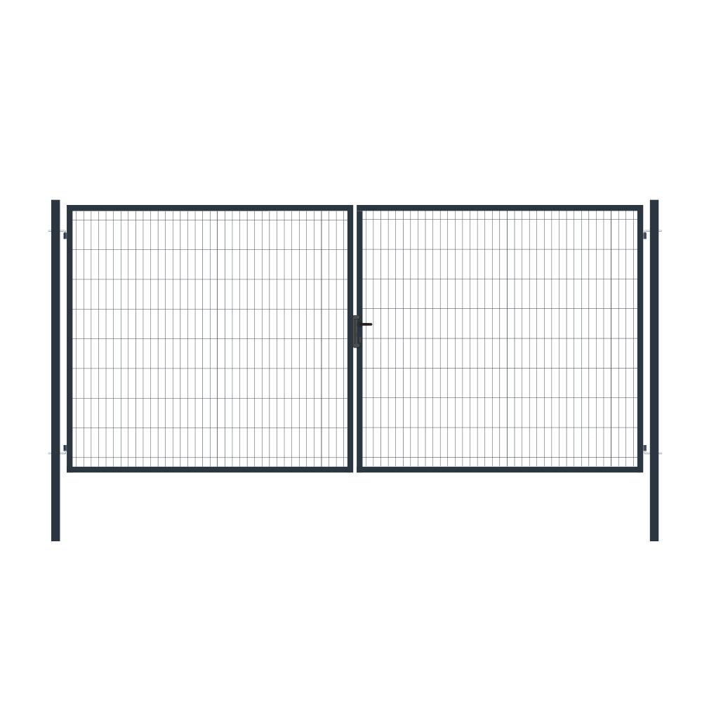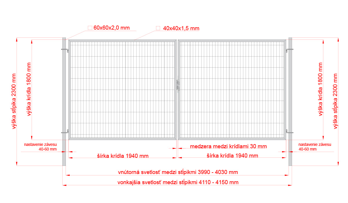 Výplň brány svařovaná síť.Rozměr oka 200x50mm.Průměr drátu 4mm. Profil sloupků 60x60x2mm.Výška sloupků 2300mm.Profil rámu 40x40x1,5mm.Povrchová úprava: ZN+RAL7016.Součástí balení je zámková část, klika, zástrč a středový doraz.