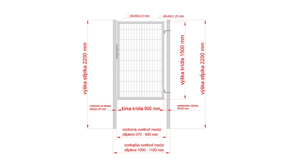 Výplň branky tvoří svařovaný 2D panel 5/4/5 o velikosti ok 200x50 mm. Výška branky je 1500 mm. Šířka branky 1000mm (samostatné křídlo branky 900mm). Profil rámu 40x40x1,5mm.