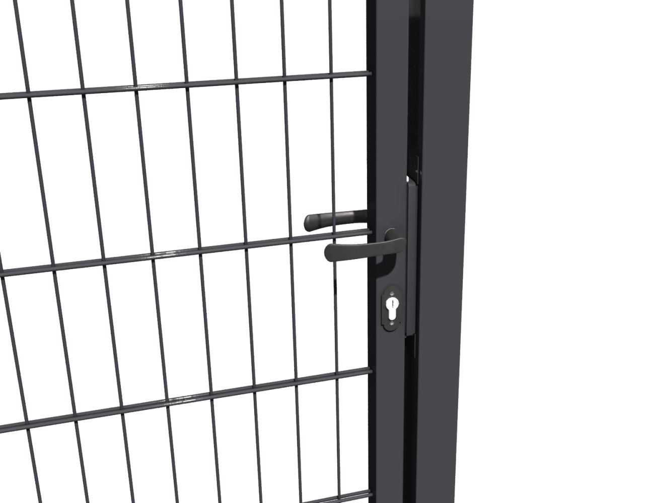 Kompletní uzamykací díl, cylindrická vložka s klíčem, zarážka brány a klika jsou součástí dodávky.