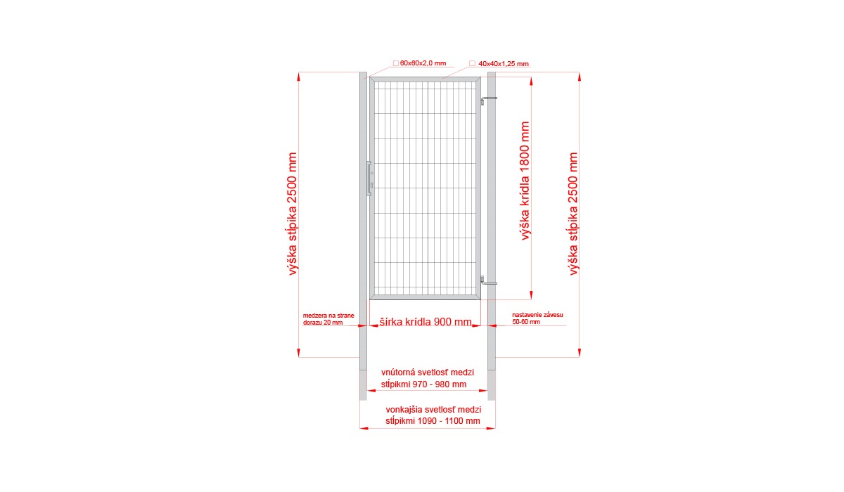 Výplň branky tvoří svařovaný 2D panel 5/4/5 o velikosti ok 200x50 mm. Výška branky je 1800 mm. Šířka branky 1000mm (samostatné křídlo branky 900mm). Profil rámu 40x40x1,5mm.