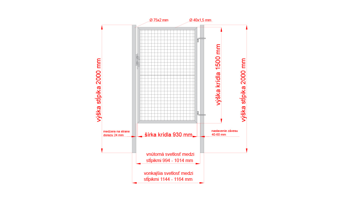 Před instalací branky si prosím zkontrolujte přechodové a osové rozměry, které se mohou lišit v závislosti na typu křídla, závěsů a zámkové části. Součástí branky je také kompletní zámková část, klika, cylindr s klíči, doraz a nerezové panty.