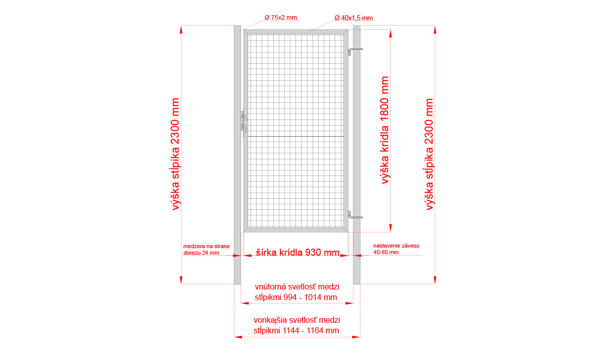 Před instalací branky si prosím zkontrolujte přechodové a osové rozměry, které se mohou lišit v závislosti na typu křídla, závěsů a zámkové části. Součástí branky je také kompletní zámková část, klika, cylindr s klíči, doraz a nerezové panty.