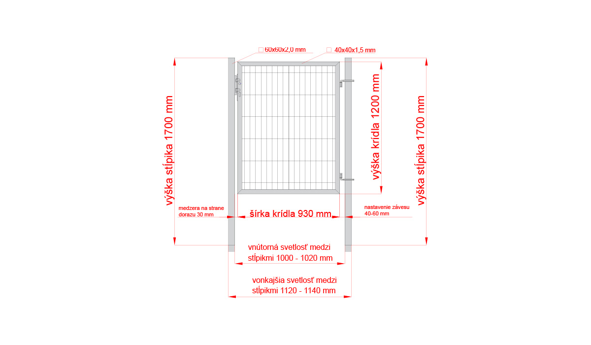 Výplň branky svařovaná síť. Rozměr oka 200x50mm. Průměr drátu 4mm. Profil sloupků 60x60x2mm.Výška sloupků 1700mm.Profil rámu 40x40x1,5mm.Povrchová úprava: zinek + RAL 7016 antracit.Součástí balení je také zámková část a klika.
