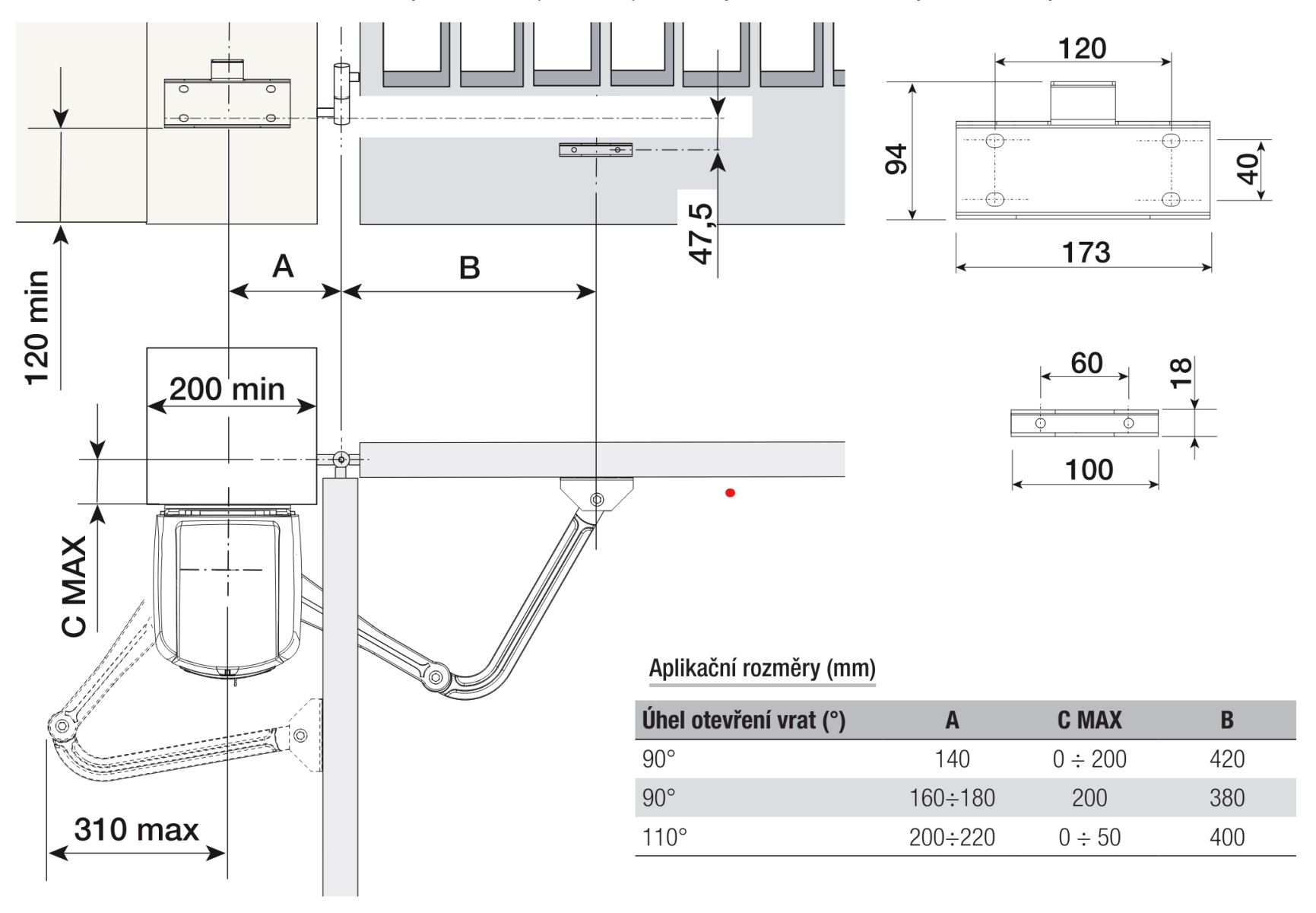 Značka: Came, Max. délka křídla: 2,3m, Hmotnost křídla (doporučená): 100kg, Frekvence (MHz): 433, Koncový doraz: Koncové dorazy nejsou potřeba, Typ kódu: Multi (fix/rolling), Složení sestavy: F7000-1x, F7001-1x, AF43S-1x,AT04EV-1x, DIR10-pár, Zpomalení motoru: Motor nemá funkci spomalení, Napájení motoru: AC 230V, Výkon: 160W, Síla: 180Nm, Rychlost: 90° - 15s, Napájení: AC 230V, Typ: Kloubové, Řídící jednotka: ZF1, Úroveň ochrany: IP54, Kondenzátor: 10uF