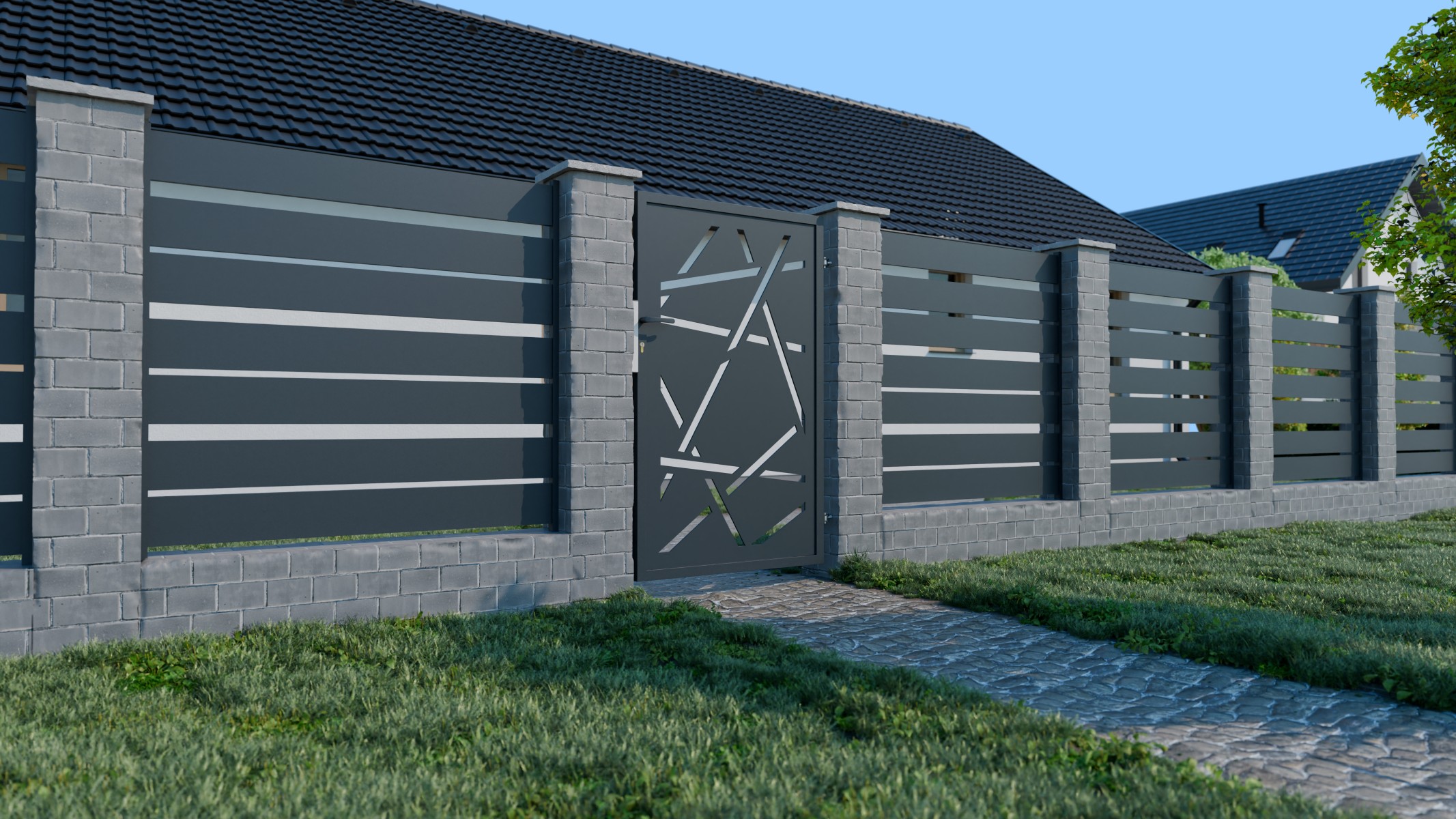 Výplň branky: designový plech HALEN.