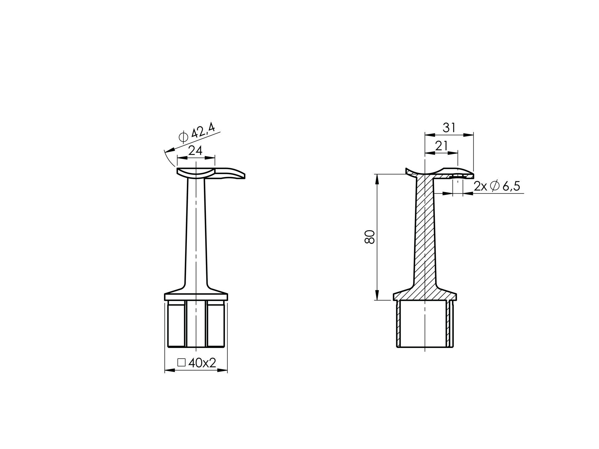Držák madla pevny pro koleno A/0303-242, bez moznosti nastavení sklonu madla. Lepený spoj držák - sloupek, montážní spoj držák madlo.