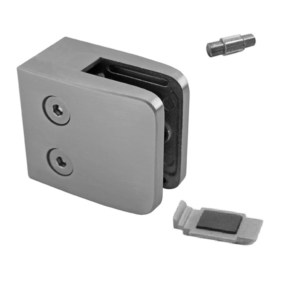 Držák skleněné (plechové, tabulové) výplně je konstrukční prvek používaný k upevnění a stabilizaci skleněné nebo plechové výplně v různých konstrukcích, jako jsou zábradlí, balkony nebo schodiště. Tento držák zajišťuje pevné a bezpečné přichycení výplně, čímž zvyšuje celkovou stabilitu a bezpečnost konstrukce. Jsou součástí moderních architektonických řešení, která kombinují funkčnost, bezpečnost a estetický vzhled. Při výběru držáku je důležité zvážit jeho materiál, design, funkčnost a kompatibilitu s konkrétní výplní a celkovou konstrukcí. Držení vyplně - pojištění vůči vypadnutí je dosaženo pomocí svěrného spoje (doporučené použití při vrchním kotvení) nebo svěrny spoj + kolik (doporučené použití pro boční kotvení) nebo svěrný spoj + bezpečnostní plotýnka (doporučeno použití pro boční kotvení). Držák neobsahuje těsnění (nutnost dokoupit 2ks těsnění pro držák dle hrubky skla).