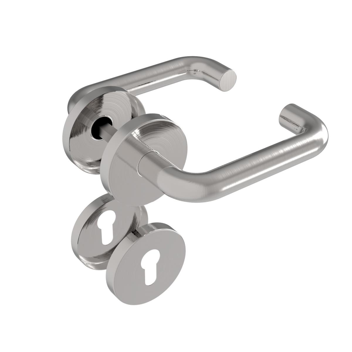 Klika se štítkem na cylindrickou vložku - 1 pár - broušený nerez, možnosť otočenia pružinového vratného mechanizmu pre zmenu smeru otvárania