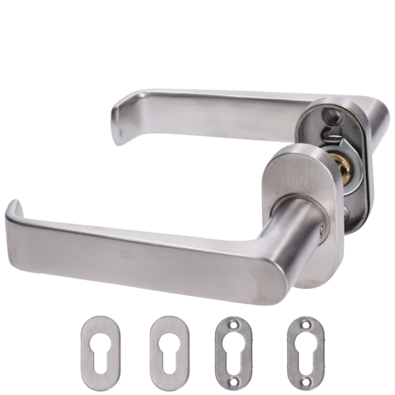 Klika se štítkem na cylindrickou vložku - 1 pár - broušený nerez, možnosť otočenia pružinového vratného mechanizmu pre zmenu smeru otvárania