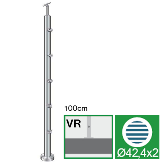nerezový sloupek D42,4mm pro madlo D42,4mm, vrchní kotvení, materiál AISI 316 brus K320, horizontální výplň 5 x d12 mm. Určeno pro rovné zábradlí výšky 100 cm, pro montáž s max. přepadem do 12 m. Možnost nastavení sklonu výplně a madla.