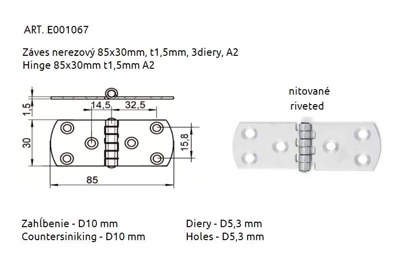 4. Pánt nerezový 85x30mm, t1,5mm, 2x3 otvory, A2
