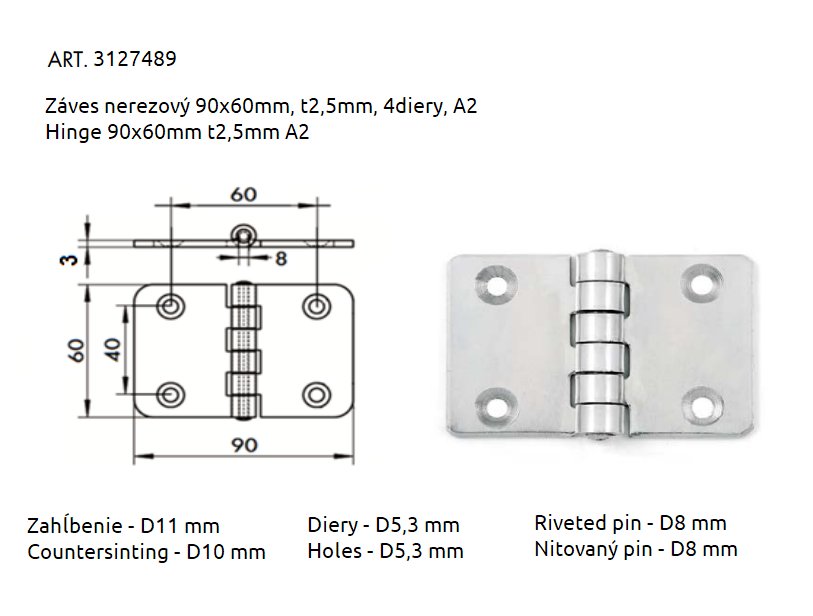 Pánt nerezový 90x60mm, t3mm, 4 otvory, A2