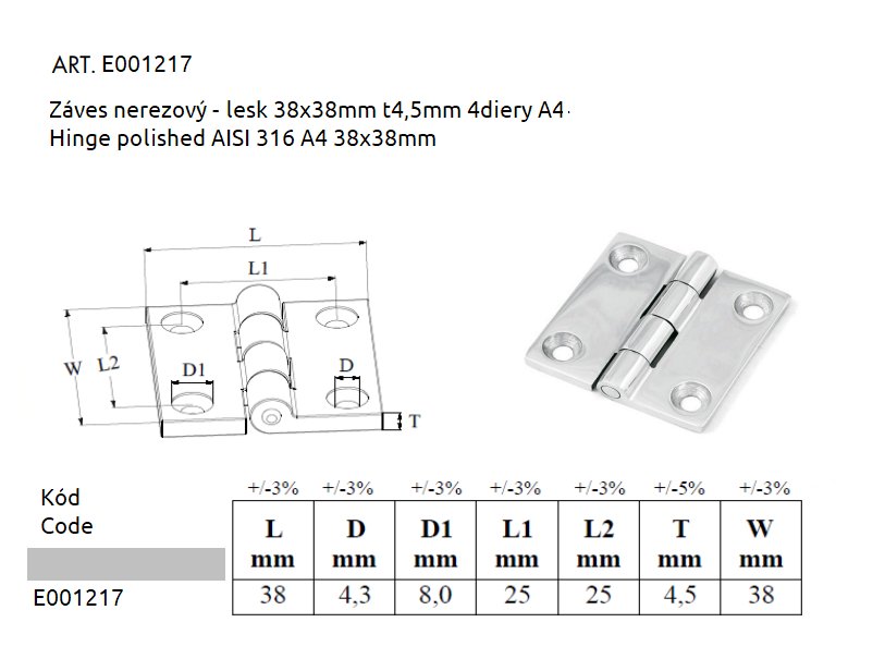 Pánt nerezový 38x38mm, t4,5mm, 4 otvory, A4.