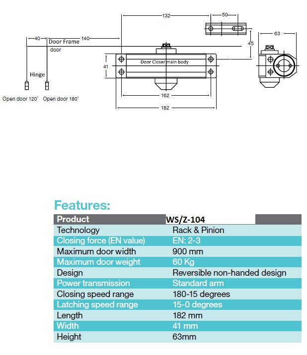Samozavírač s plynulým nastavením zavírání 180 ° -15 ° a15 ° -0 °, rozměry 182x41x63mm. Maximální šířka dveří 900mm, váha dveří do 60kg.