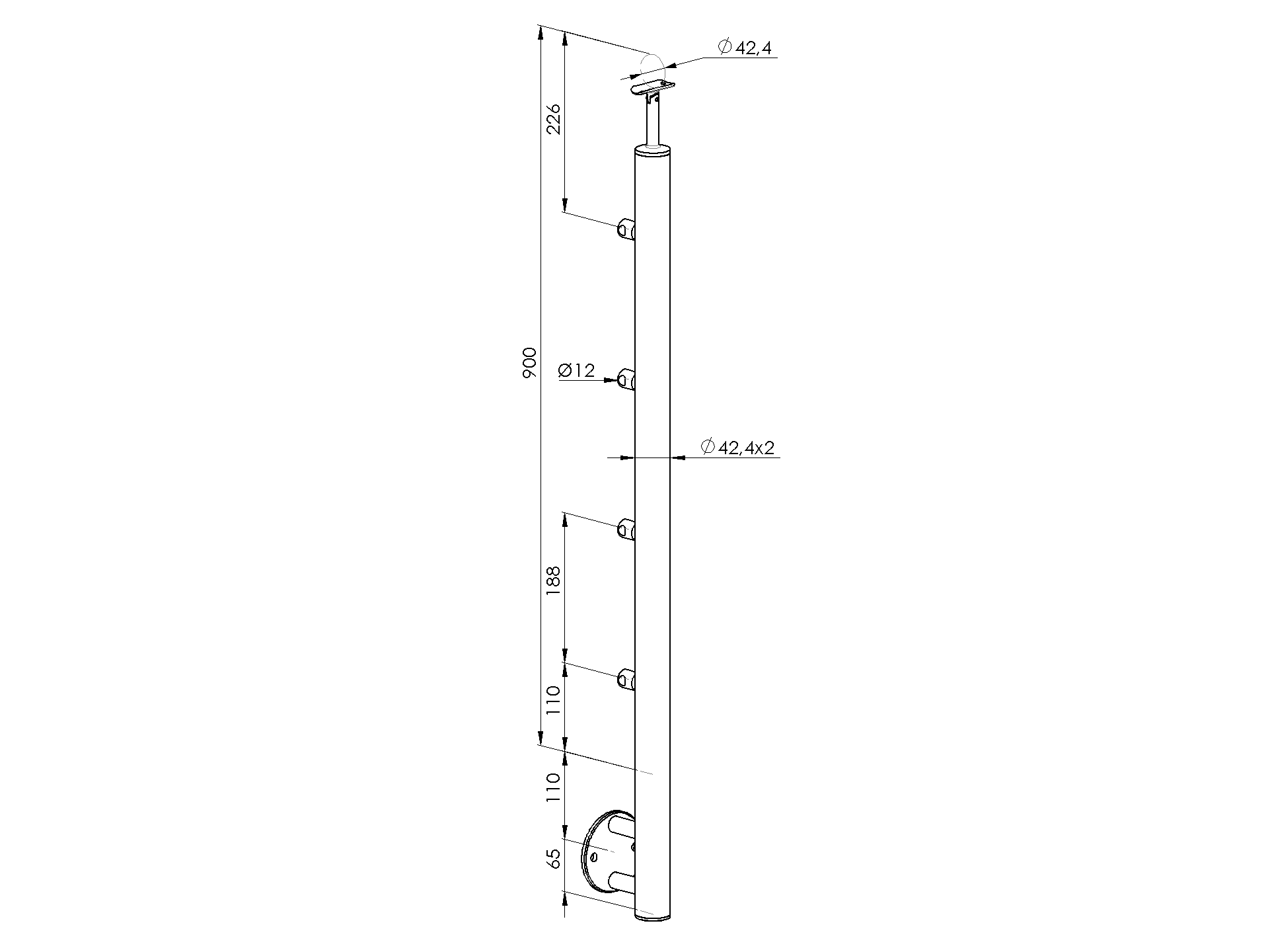 Nerezový sloupek D42,4 mm pro madlo D42,4 mm, boční kotvení. Horizontální výplň 4 x d12 mm. Určeno pro rovné zábradlí výšky 90 cm, pro montáž s max. přepadem do 3 m. Možnost nastavení sklonu výplně a madla.