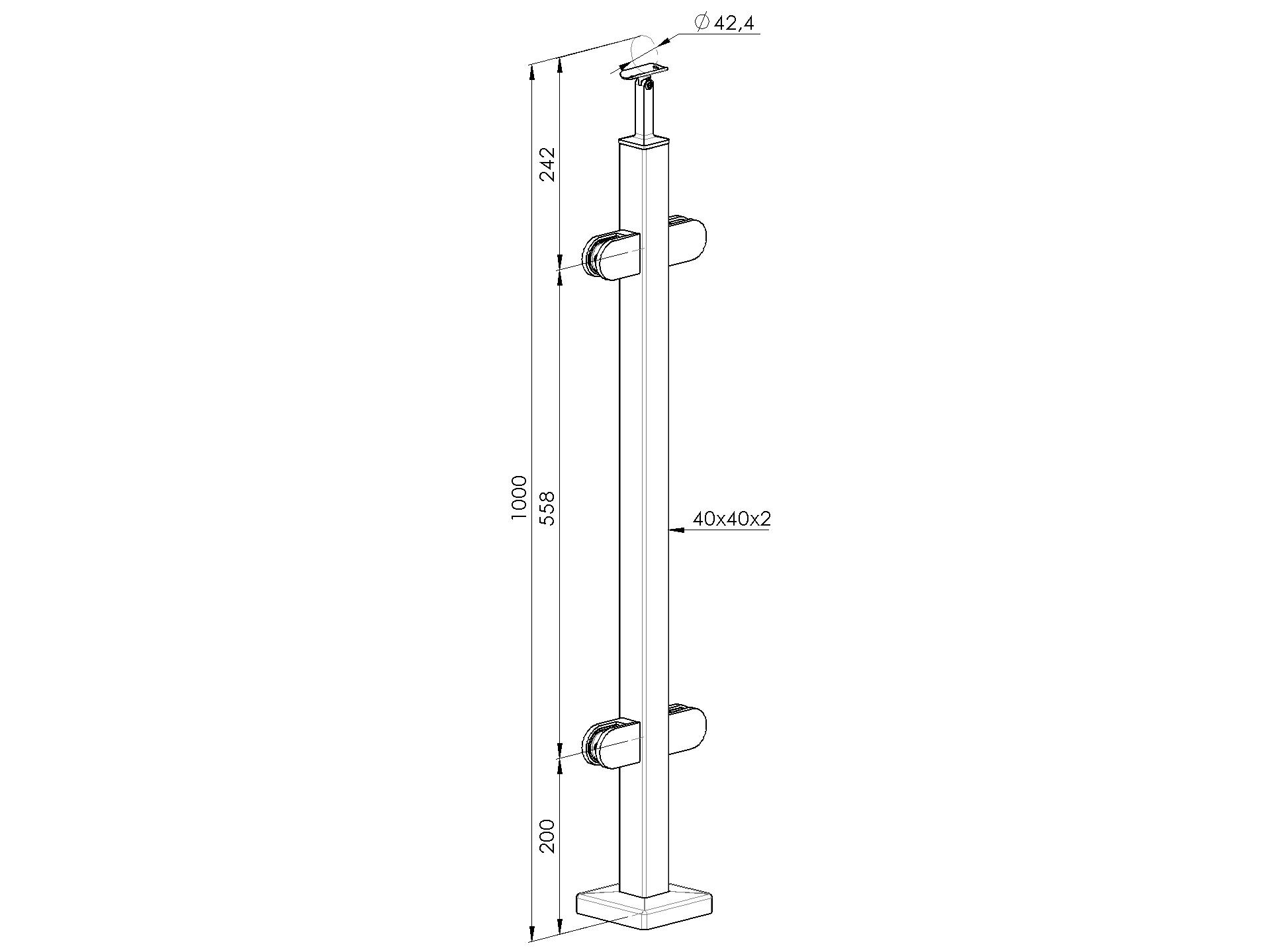 Nerezový jeklový sloupek s navařenou kotvící přírubou a krycí rozetou. Součástí sloupku je nastavitelný držák madla a držáky skla (pro sklo tloušťky 8,76 mm). Používá se k výrobě 1000 mm vysokého zábradlí se sklem jako vnitřní sloupek. Kotvící materiál není součástí.