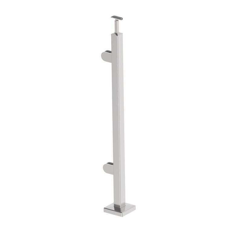 Nerezový jeklový sloupek s navařenou kotvící přírubou a krycí rozetou. Součástí sloupku je nastavitelný držák madla a držáky skla (pro sklo o tloušťce 8,76 mm). Používá se k vytvoření 1000 mm vysokého zábradlí se sklem jako koncový sloupek. Kotvící materiál není součástí.