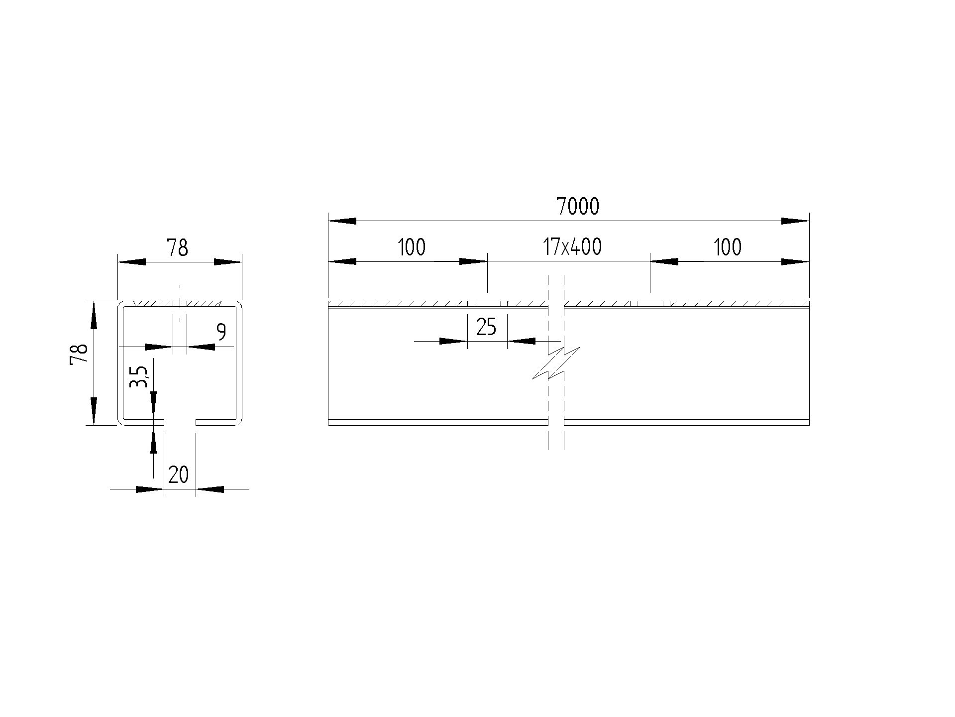 Vodíci profil s otvory Zn, 78x78x3,5mm, L7m