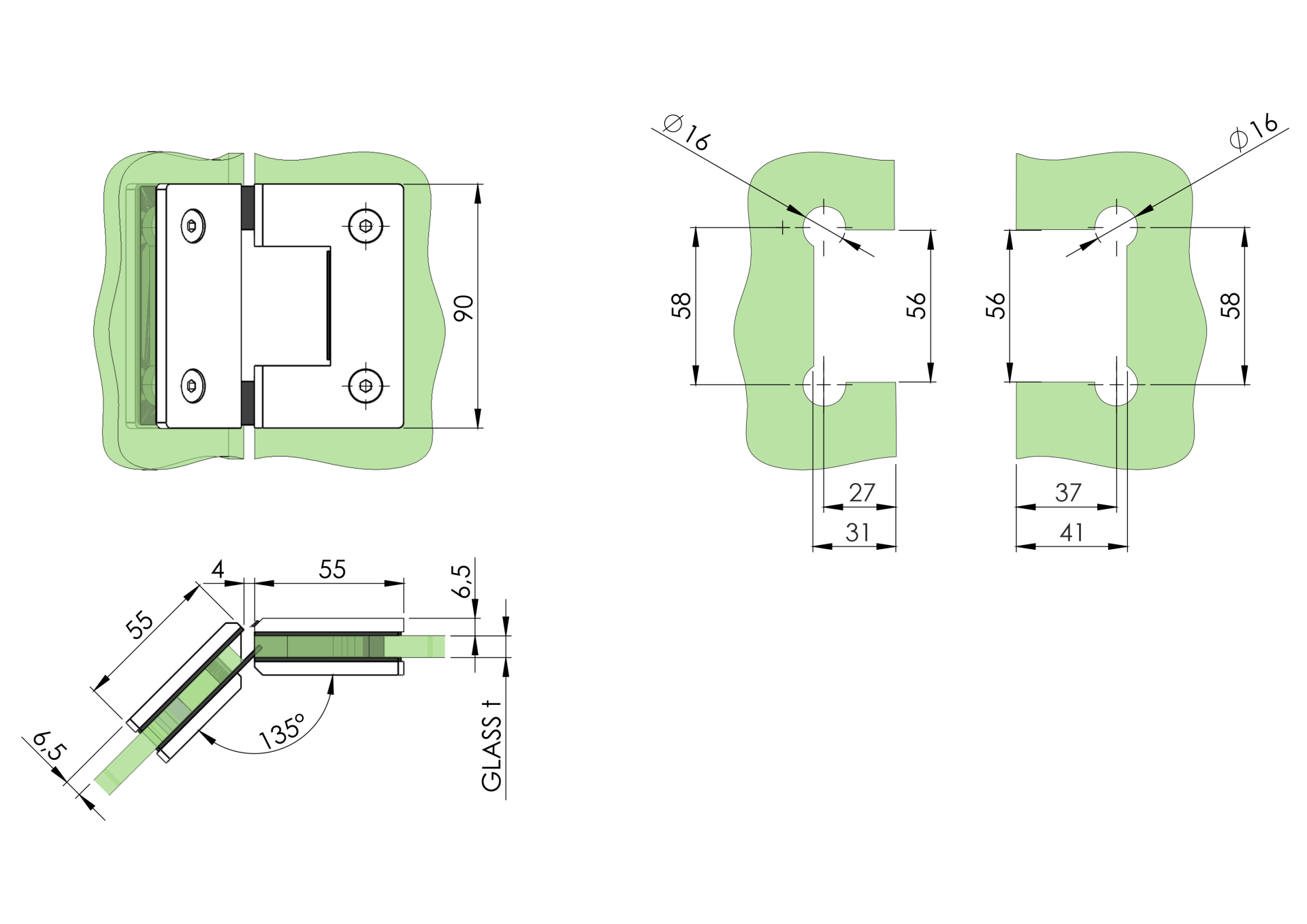 Materiál: Nerez AISI 304, Povrchová úprava: Brus, Glass t: 8-10, Výplň: Sklo, Gmax(kg)/2pcs: 45, Kotvení: Na sklo, Funkce samozavírání: +-15°, Funkce stop: +-90°/0°, h: 90, b: 55, Otvor ve skle: Ano